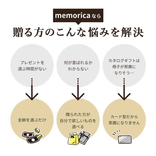 memorica(メモリカ)はギフトカードを受け取られた方が、ネット上の「memorica 商品交換サイト」を利用して贈られたポイントを使って、自由に商品交換ができる新しいコンセプトの贈り物です。