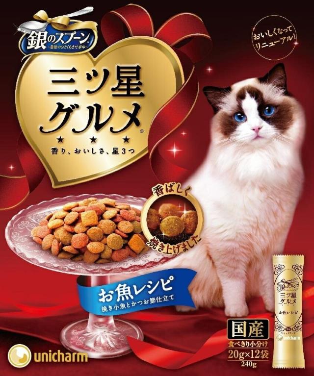 穀類(トウモロコシ、小麦粉等)、肉類(チキンミール、ポークミール、ビーフミール、チキンエキスパウダー等)、油脂類、魚介類(フィッシュエキスパウダー、煮干パウダー、鰹節、マグロミール、白身魚ミール、乾燥シラス等)、ビール酵母、酵母エキスパウダー、ミネラル類(カルシウム、塩素、コバルト、銅、鉄、ヨウ素、カリウム、マンガン、リン、亜鉛)、調味料、ビタミン類(A、B1、B2、B6、B12、C、D、E、K、コリン、ナイアシン、パントテン酸、ビオチン、葉酸)、着色料(二酸化チタン、赤色102号、赤色106号、黄色4号、黄色5号)、アミノ酸類(タウリン)、酸化防止剤(ミックストコフェロール、ハーブエキス)