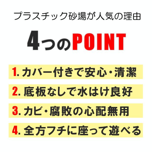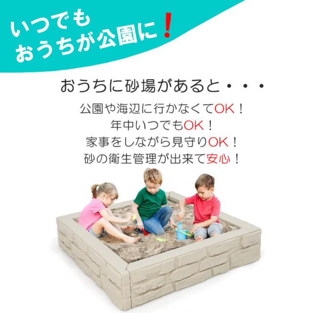 動物から砂場を守るカバー付き 座って遊べる椅子付き 遊んでいない間に動物に砂場を 荒らされてしまったり、 風で砂が舞ってしまうのを防ぐ カバーが付属します。 砂場の縁にはベンチ付きで座って遊ぶ事ができます。 砂遊びが終わる頃にはガーデニングを楽しむ花壇としてもお使いいただけます。 容量:砂 約195kg ※砂・おもちゃ等は付属しません |