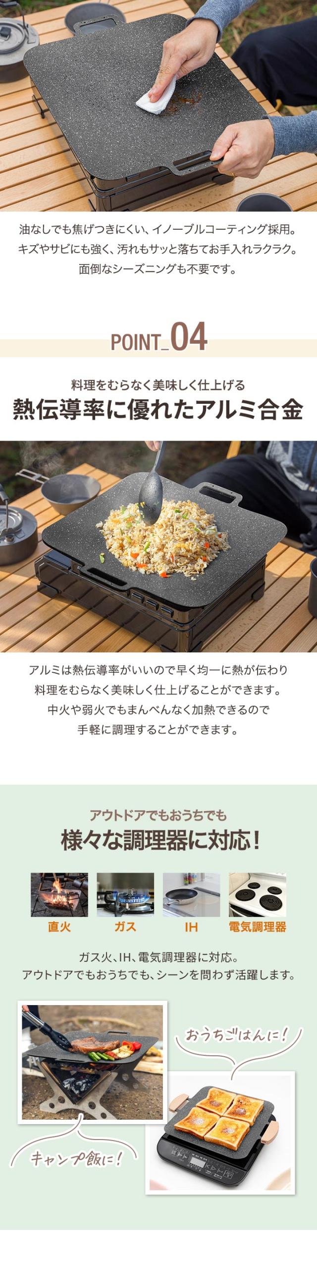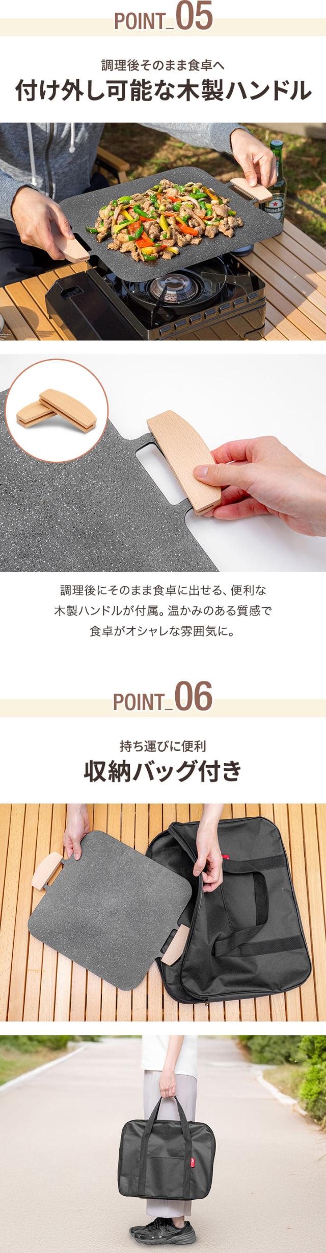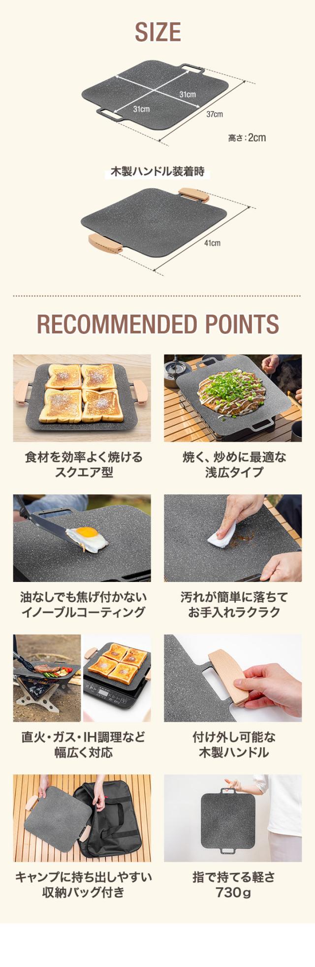 | 特記事項: ※直火・ガス・IH・電気調理器など様々な熱源で使用可能。 ※シーズニングは必要ありません。 ※食洗器には対応しておりません。 ※家庭用カセットコンロでご使用される場合、グリドルパンがカセットコンロ本体を覆ってしまうと輻射熱がガスボンベを発熱させる恐れがありますので、熱したグリドルパンまたはハンドルをガスボンベに触れない、近づけないよう、十分に注意して下さい。 ※付属の木製ハンドルはFIELDOOR製スクエアグリドルパン31cmに取り付け可能です。 ※調理中は木製ハンドルを外してください。 |