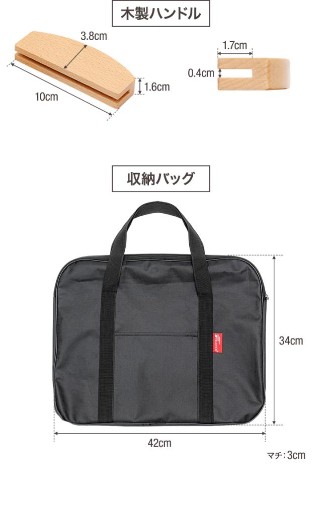 | サイズ: 本体:(約)幅31cm(37cm ※ハンドル含む)×奥行き31cm×高さ2cm 木製ハンドル:(約)幅10cm×奥行き3.8cm×高さ1.6cm ※1個あたり 収納バッグ:(約)幅42cm×待ち3cm×高さ34cm |