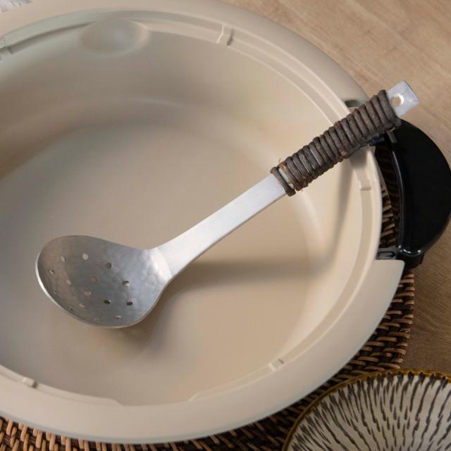 同じシリーズのアケビ巻きお玉を穴無し・穴明きで全部で6種類ご用意しております。軽くて丈夫なアルミシリーズは、キッチンはもちろん卓上での使い勝手も抜群。気付くと手に取っている、そんな愛用品になるかもしれません。