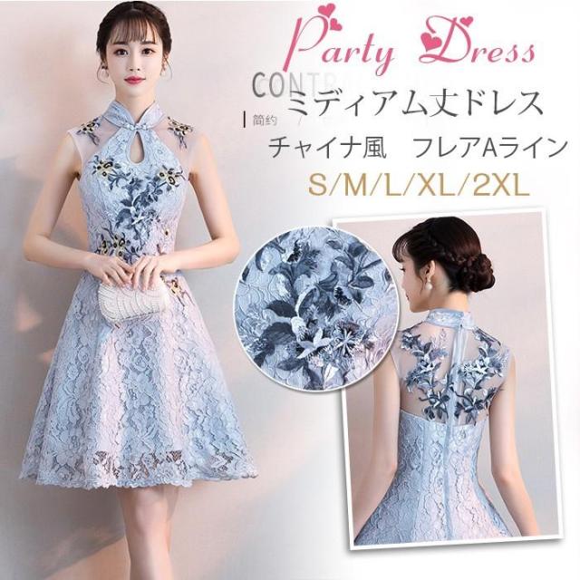 パーティードレス 結婚式 ドレス 袖なし 卒業式 大人 ドレス ミディアム丈ドレス 可愛い チャイナドレス フレアAライン ドレス パーティー お呼ばれドレス