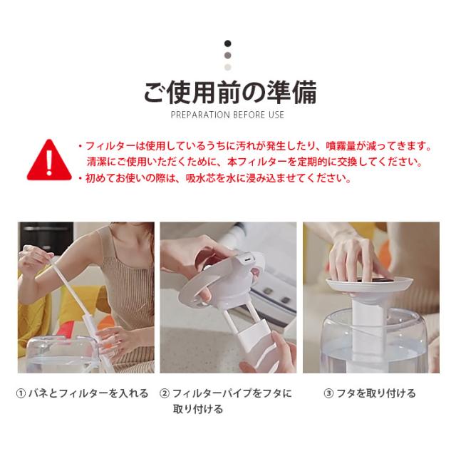 ・フィルターは使用しているうちに汚れが発生したり、噴霧量が減ってきます。清潔にご使用いただくために、本フィルターを定期的に交換してください。