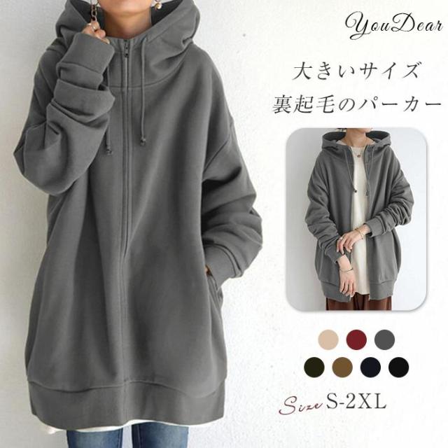 パーカー ロングパーカー トレーナー スウェット ファスナー フード付き フェイクレイヤード 秋 裏起毛 大きいサイズ ポケット アウター カジュアル 無地
