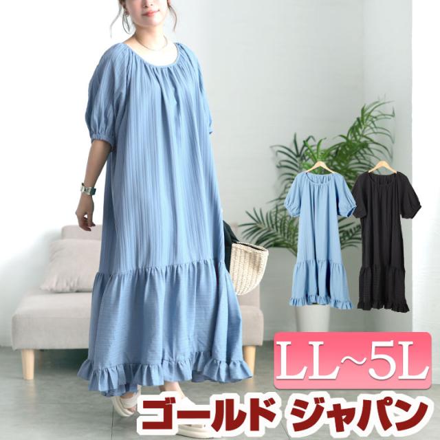 春新作 大きいサイズ レディース ワンピース ストライプドビーティアードフリルワンピース ワンピ ロングワンピース ロング ティアード フリル ドルマン ギャザー バルーンスリーブ ストレッチ ゆったり 夏服 秋服 春服 LL 2L 3L 4L 5L ブルー ブラック 黒 ゴールドジャパン