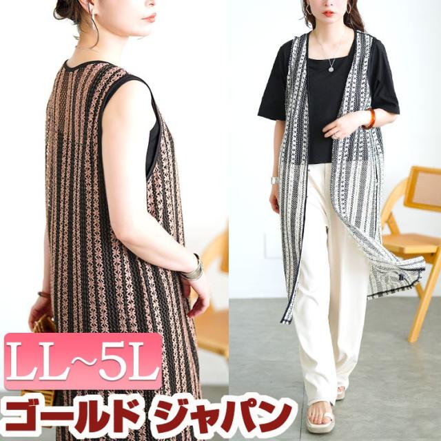 春新作 大きいサイズ レディース トップス ベスト ジレ クロッシェ編みツートンレースロングジレ ロングジレ ロングベスト カーディガン ノースリーブ ロング クロッシェ編み 刺繍 透け感 ゆったり 夏服 秋服 春服 LL 2L 3L 4L 5L ブラック 黒 オフ モカ ゴールドジャパン