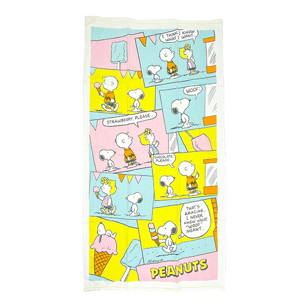 夏に人気のアイスクリーム柄とポップな色合いが可愛いスヌーピーのバスタオルです。とっても可愛いデザインなのでスヌーピーの好きの方にはたまりません♪洗濯機で洗えるので汚れてもすぐに洗えて、清潔に使えて普段使いにぴったりです☆彡