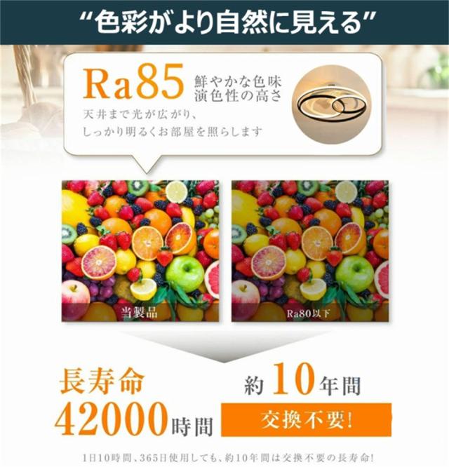 演色性が高い 演色性が高いほどのシーリングライト、自然光に近いとされているので、文字がはっきりと見やすく、花の色や料理の色や人の肌色美しく自然に見えます。廊下、和室、寝室、洗面所、居間、書斎、トイレ、天井照明、キッチン照明が最適です。