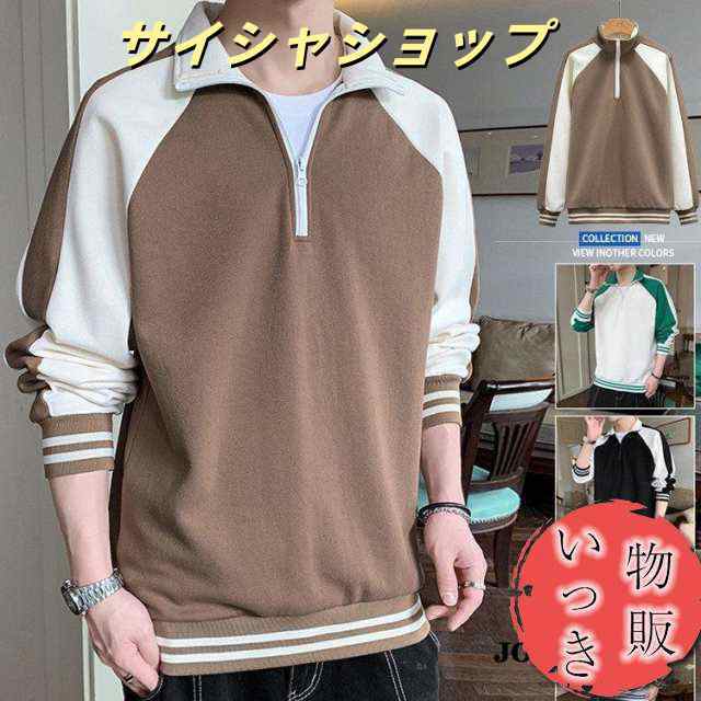 トレーナー メンズ 長袖 襟付き 半ジップ プルオーバー トップス 配色 切り替え スウェット フードなしパーカー ファスナー