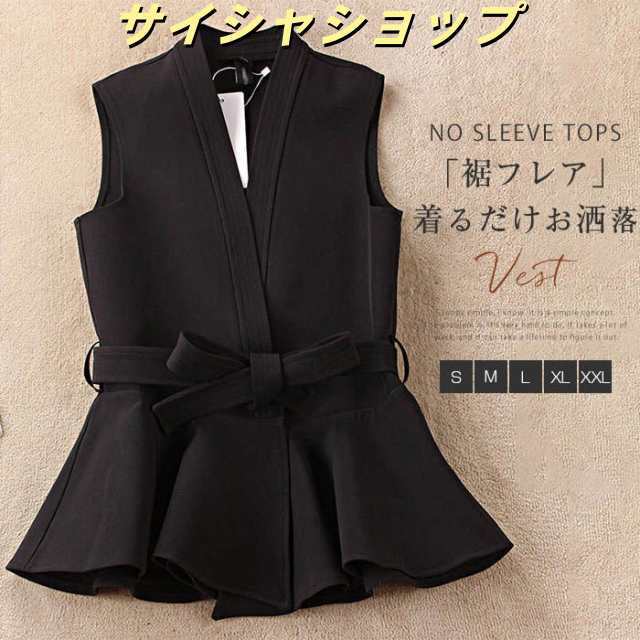 ベスト レディース ジレ カットソー トップス ペプラムトップス Vネック ノースリーブ ウエストリボン 裾フレア 体型カバー ブラック 無地 シンプル かわいい キュート カジュアル