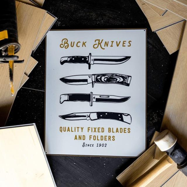 長年愛され続けるナイフブランド「BUCK」のクラシックデザインなブリキ看板。