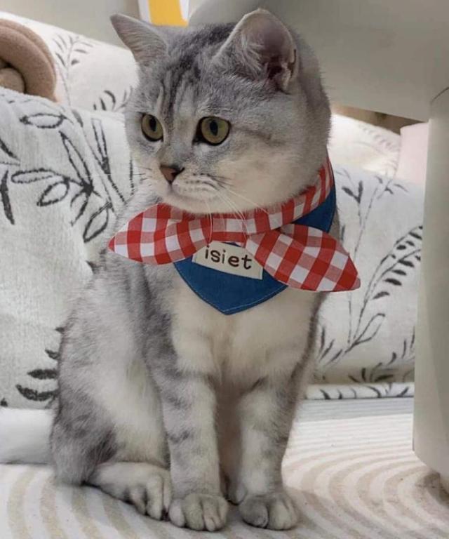 デニム風の生地に赤いギンガムチェックのリボンがアクセントになった、おしゃれなペット用スカーフ。スナップボタンで着脱も簡単、首元に優しくフィットするデザインです。