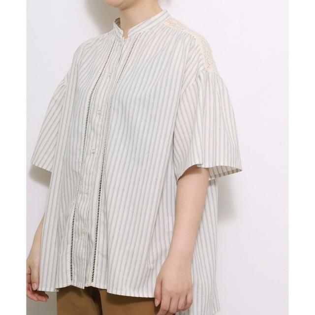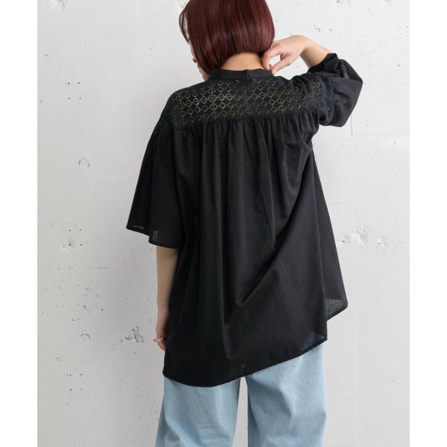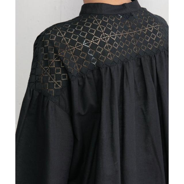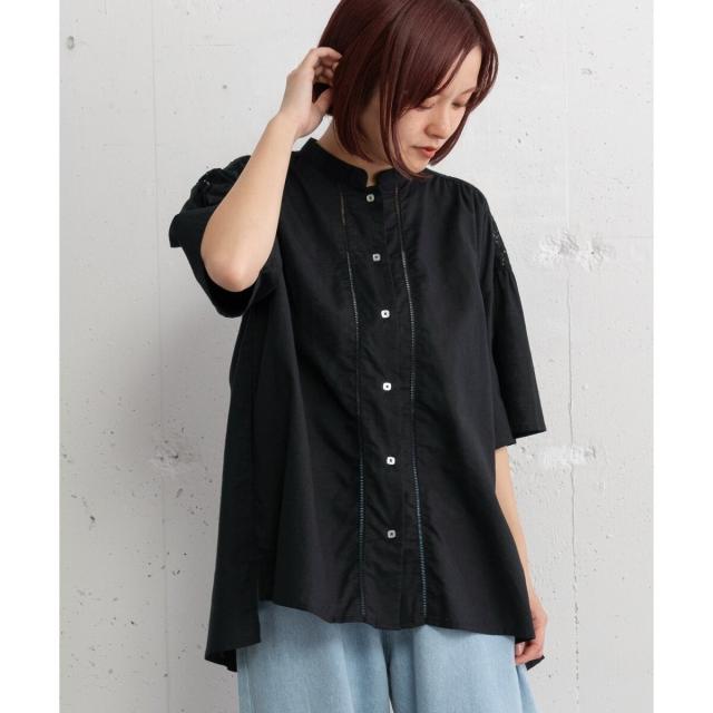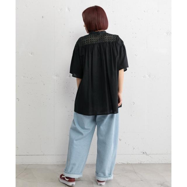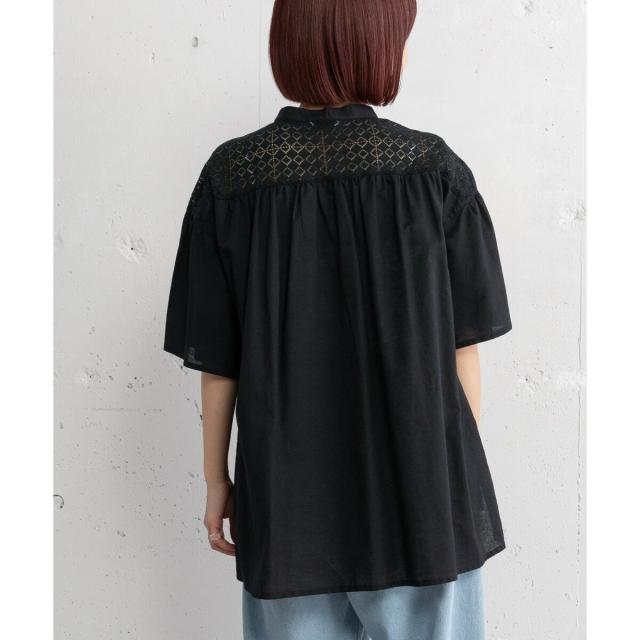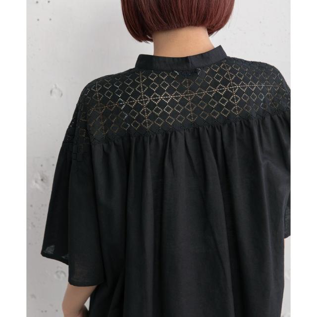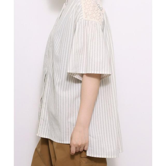 ギャザー入りのフレアスリーブが可憐なブラウス。ヨークとフロントのレース使いがアンティーク感のあるデザイン。ドライなタッチのリネン混生地を使用しており、さらりと快適な着心地です。ゆったりとしたサイジングで風通しが良く、真夏にも着やすい。肘が隠れる長めの袖丈で、カジュアル過ぎず、大人の女性に似合うシルエットに仕上がりました。トップスとしても、軽めの羽織りとしてもお使いいただけます。