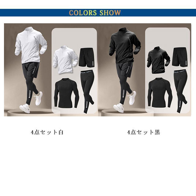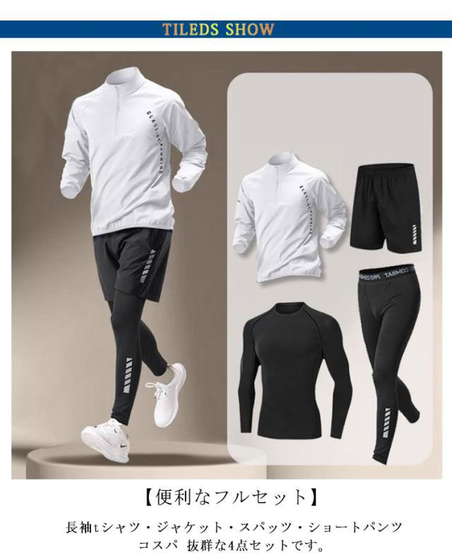 | 【スポーツウェア 上下4点セット】【接触冷感】【吸水速乾】【ストレッチ】 【便利なフルセット】 長袖tシャツ・ジャケット・スパッツ・ショートパンツ コスパ 抜群な4点セットです。 【接触冷感機能搭載】 ひんやり感が気持ちいい接触冷感素材で快適な着心地に。 【通気性、吸水性・速乾性抜群】 通気性、吸水性、速乾性に優れ、汗をかいても快適にご着用頂けます。 また、お洗濯しても乾きやすいのも嬉しいポイントです。 【伸縮性に優れたコンプレッションウェア】 伸縮性の高いストレッチ素材を採用。 身体に圧をかけることで、さまざまなサポート効果をもたらす機能性ウェアです。 どんな動きにも自然にフィットし、使用感抜群です。 【様々なスポーツシーンで大活躍!】 スポーツフィットネス、ジョギング、ボクシング、散歩、ランニング、筋肉トレーニング サイクリング、登山、レジャー等スポーツに最適!! | |