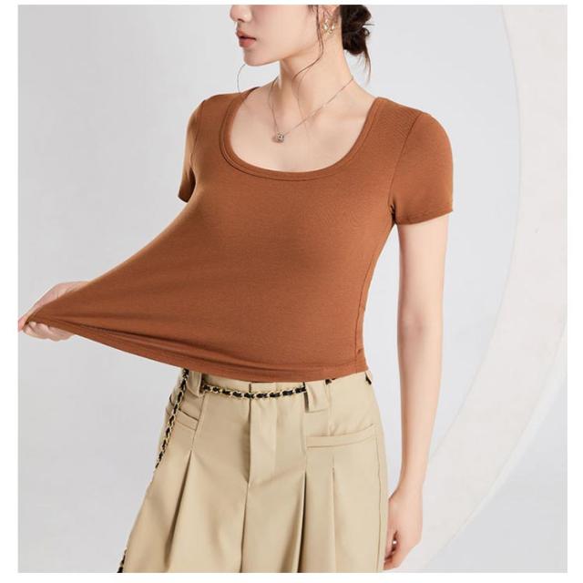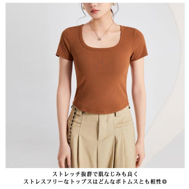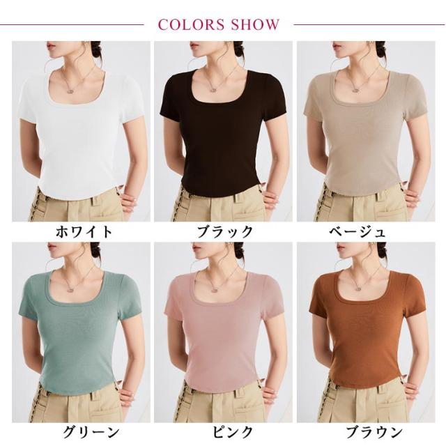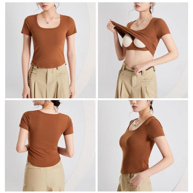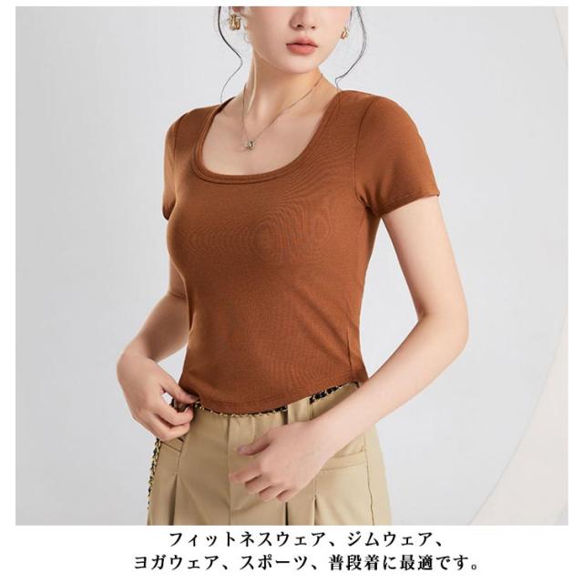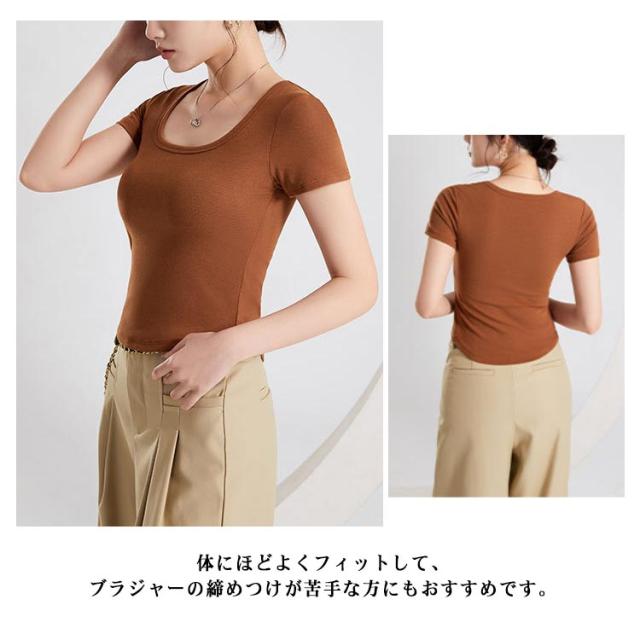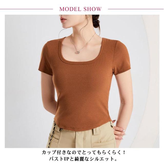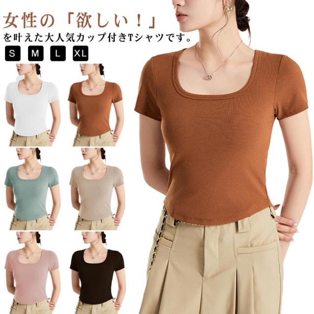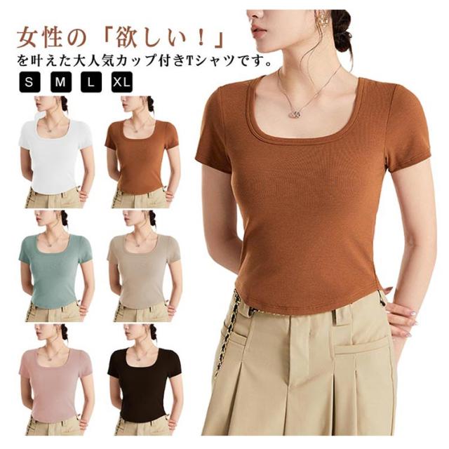 カップ付き Tシャツ レディース ブラトップ トップス カットソー 半袖 スクエアネック 女性 婦人 トップス ハーフトップブラ カップ付き 半袖 ショート丈 へそ出し カットソー プルオーバー 無地 単色 シンプル ジム トレーニング 運動