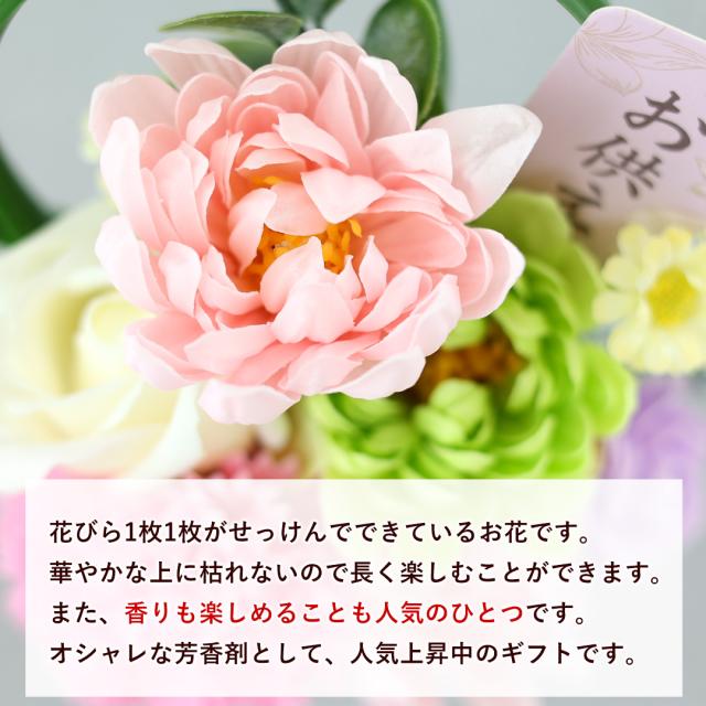 手間いらずで長く飾れる、お供え用の贈り物として最適なソープフラワーです。