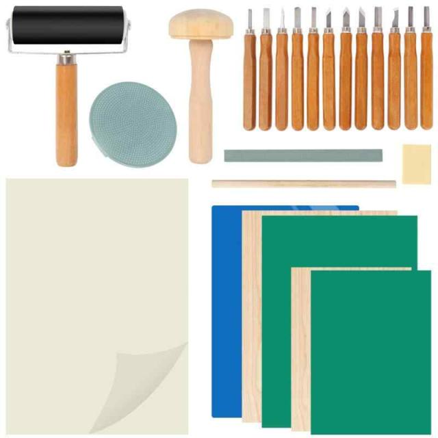 YTOPRO 版画彫刻セット 木版画 彫刻刀12本入り ゴムローラー ベニヤ板2枚 両面使用可能 ビニール板2枚 版画用宣紙 バレン2個 ローラートレー 彫刻刀 専用砥石 消しゴム 鉛筆付き DIY手作り版画キットセット