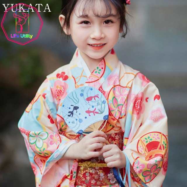 桜 ブルー 綿混紡 浴衣 子供 バースデイ ワンピース 女児 七五三 韓国子供服 90 100 110 120 130 140 150 160 長襦袢 可愛い 花柄 夏祭り 3/4/6/7点セット 単品