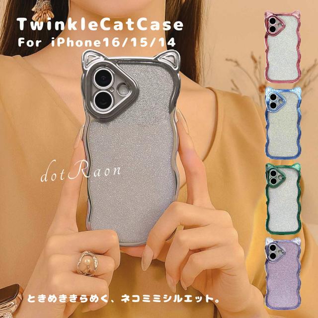 iPhone16 ケース iPhone16Pro ケース iPhone15 ケース iPhone14 ケース 韓国 おしゃれ 可愛い かわいい きらきらインナーシート ケース アニマル ネコ 猫 耐衝撃 ウエーブ クリアケース 透明 エレガント 猫耳 グリッター