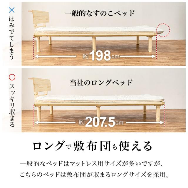 敷布団がそのまま使えるロングサイズです。床面高さは3段階調節可能。