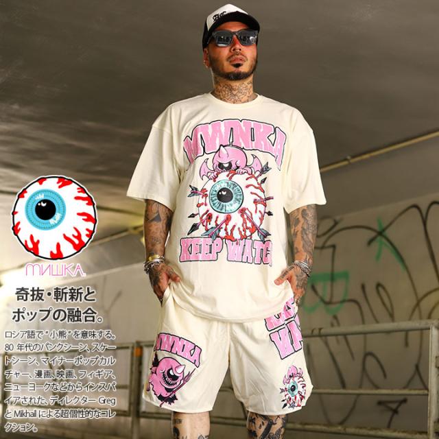 MISHKA 上下セット 半袖 ブランド Tシャツ ハーフパンツ メンズ 春夏用 白 青 大きいサイズ ミシカ セットアップ 派手 総柄 KEEPWATCH キープウォッチ 小悪魔 ビッグシルエット b系 ヒップホップ ファッション ロック ストリート系 ハイ 2025春夏 新作 MSK-144-5
