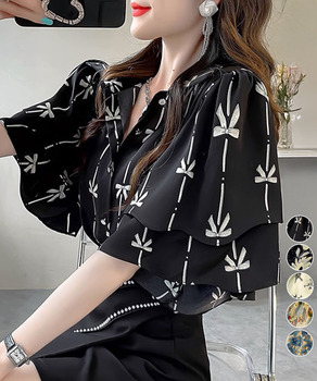 総柄ブラウスダブルフレアスリーブトップス 送料無料 即日発送