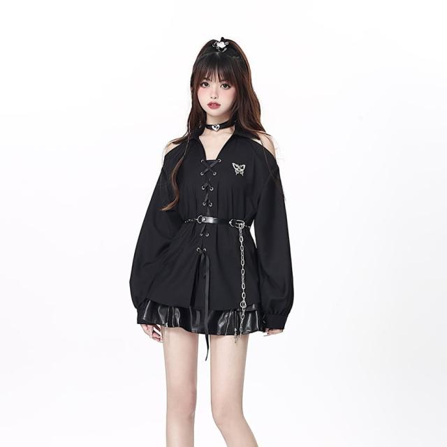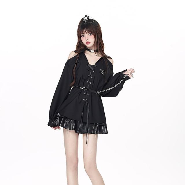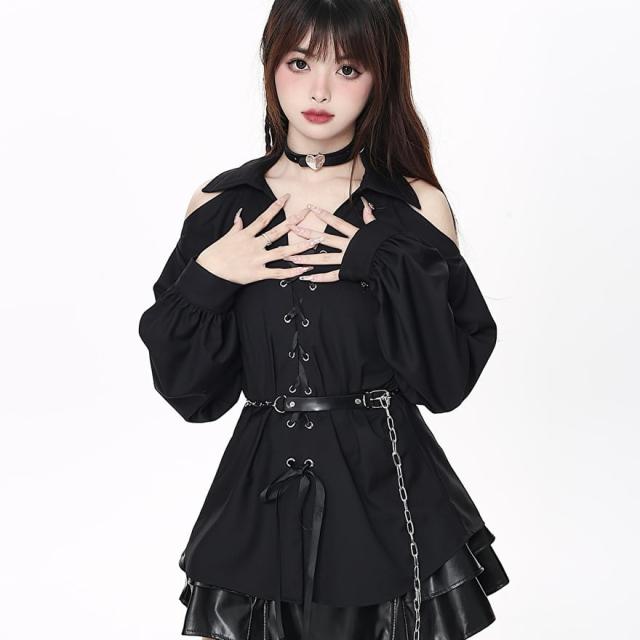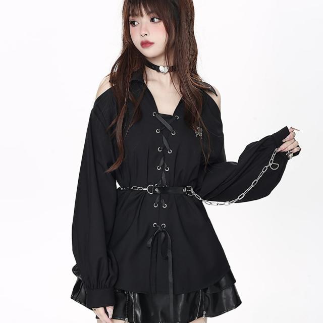 黒色のロリータ系長袖シャツです。肩の部分が大きく開いたオフショルダーのデザインで、胸元はレースアップになっています。袖はボリュームがあり、手首で絞られたデザインです。ウエストには取り外し可能なチェーンベルトが付いています。