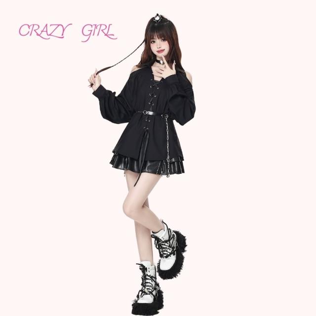 地雷系 甘辛MIX 編み上げ シャツ ミニワンピ レースアップ オープンショルダー