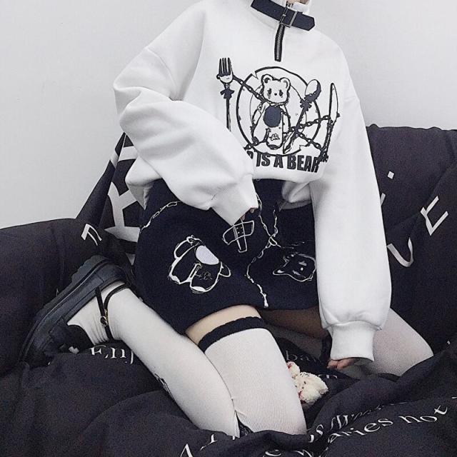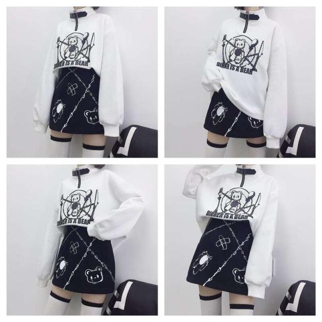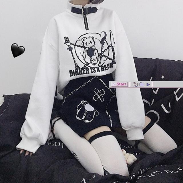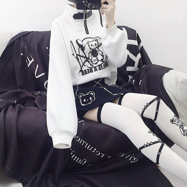 白色のロリータ系長袖トップスです。黒いベルト付きハイネックで、前面にジッパーが付いています。胸元には、チェーンやナイフ、拘束されたクマのイラストと英文のプリントが施されています。