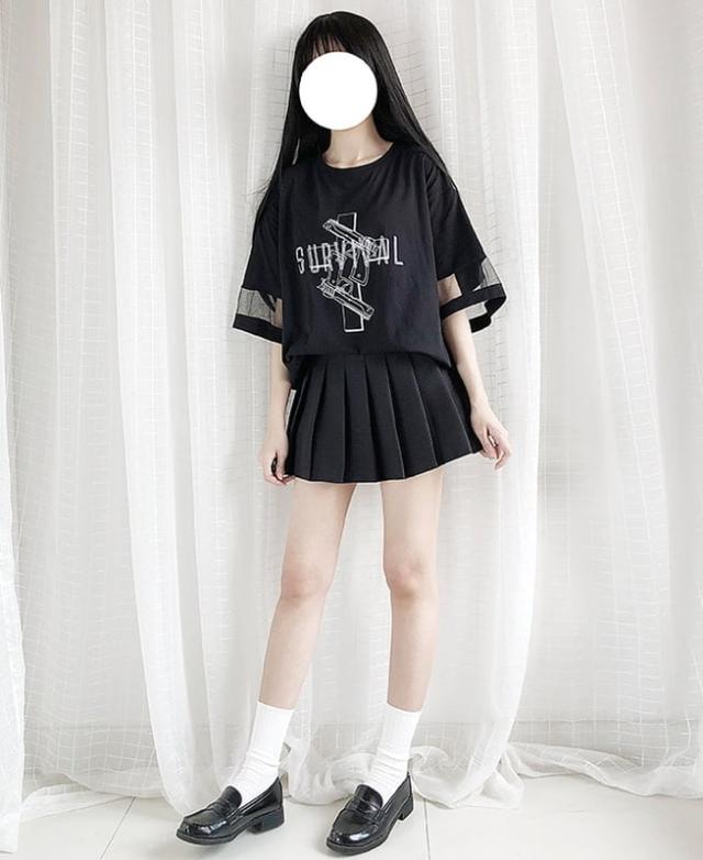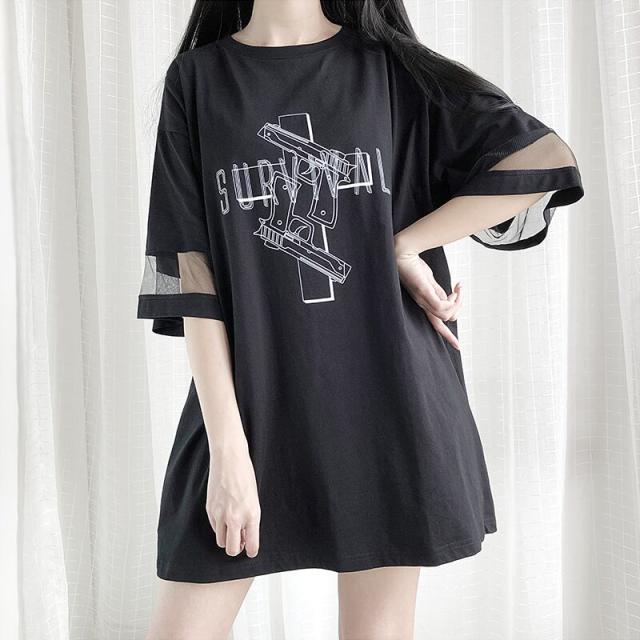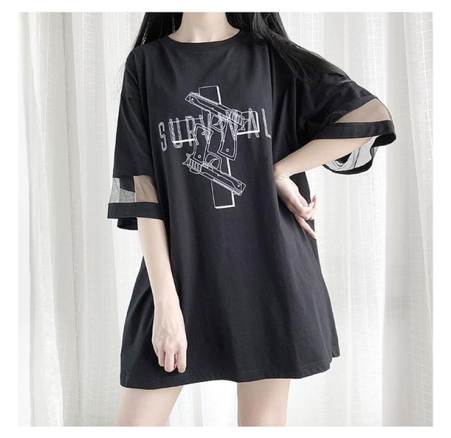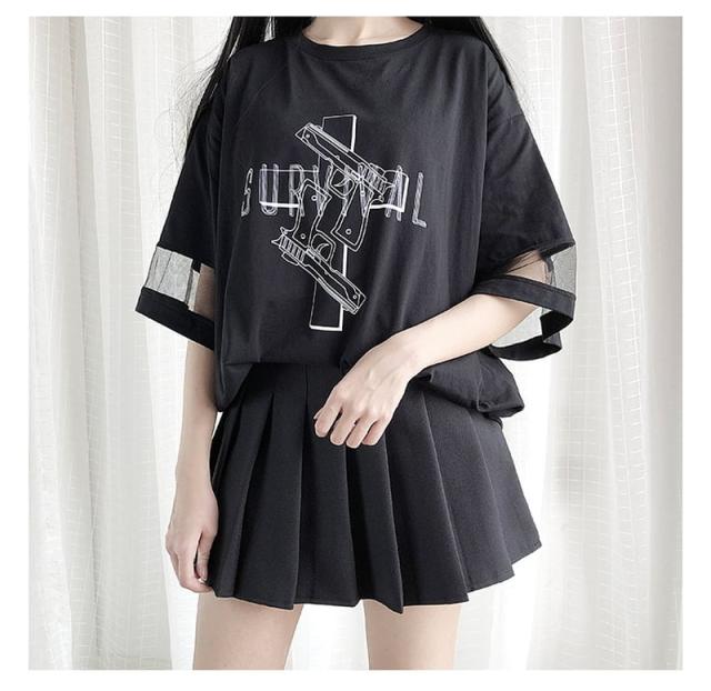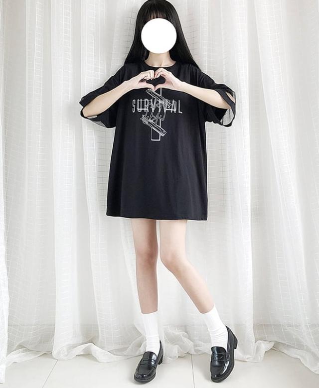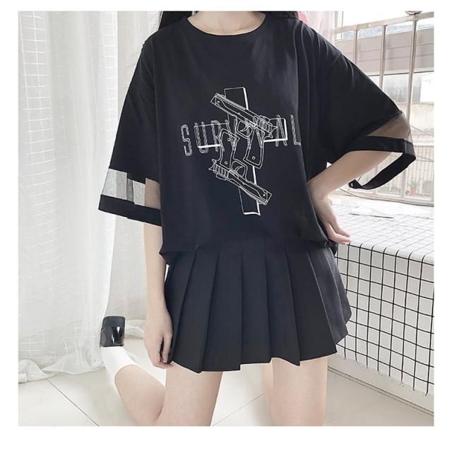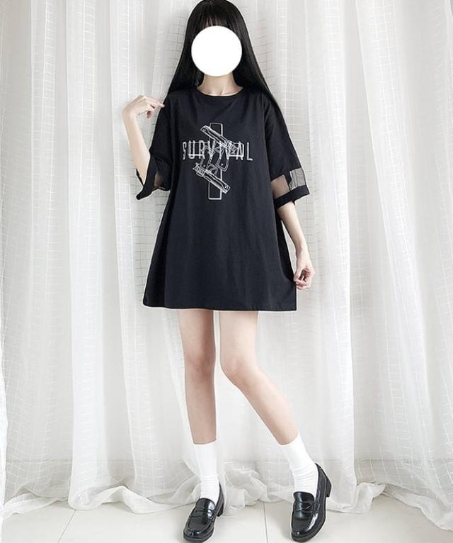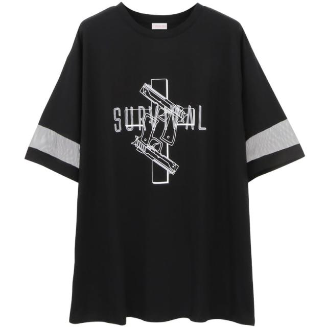 ピストル SURVIVALロゴがちょっぴり病みかわいい7分袖Tシャツです。ちょっぴり病んでるデザインに袖は透け感たっぷりなシースルーがインパクト抜群。