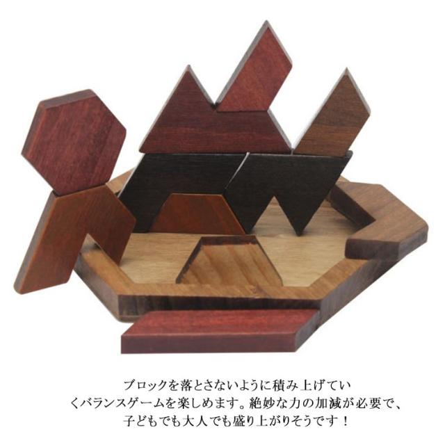 | 想像力育成に最適の模様作りパズル♪ フレームの中で全てのピースをはめ込んでパズルを完成させたり、ピースで様々な形を作ったり遊び方はいろいろ! ブロックを落とさないように積み上げていくバランスゲームを楽しめます。絶妙な力の加減が必要で、子どもでも大人でも盛り上がりそうです! この木製パズルは子供の想像力をつける、目と手の調整や色と形の認識など訓練します。楽しく遊びながら、子どもの能力をぐんぐん伸ばす知育玩具です 六角形、正方形、台形、平行四辺形など…積み木・ブロックの無限の組み合わせがあなたのお子様の想像力・構成力を養うでしょう! | |
