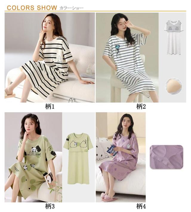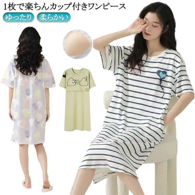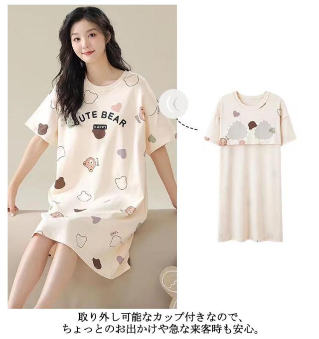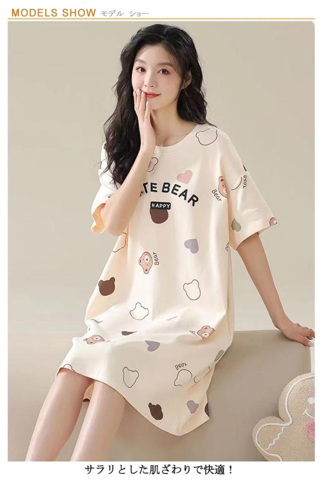 ワンピース 半袖 パジャマ 熊 膝丈 パジャマ レディース ルームウェア 英字 ロングTシャツ カップ付き 女性 部屋着 ワンピ リラックス 可愛い ゆったり 薄手 涼しい 柔らかい 春夏