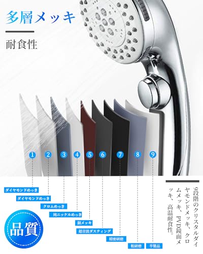ワーヘッド、節水器、塩素除去フィルター、水漏れ防止ゴムリング、シールテープ、予備ゴムリング、4つの異なる種類のアダプターを同梱してお届けします。