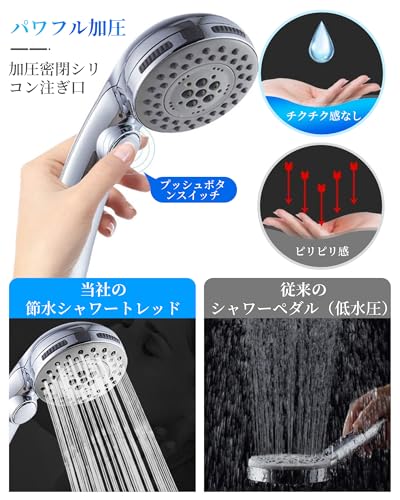 当社のシャワーヘッドは、革新的な節水テクノロジーにより、従来のシャワーヘッドと比べて最大90%もの節水効果があります。また、強力なウォータープレッシャーにより、シャワーの質を損なうことなく、心地よいシャワー体験を提供します。