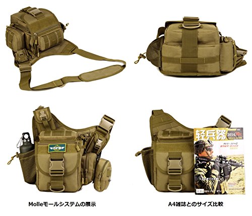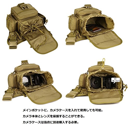 構造:1.正面チャック付き仕切りポケット:5.7インチのスマホ、銀行カード、レシートなどが格納可能。 2.内側ファスナーポケット:iPad mini、7インチのタブレットPC、iPad4本体などが格納可能。 3.上部ファスナーポケット:メガネ、ティッシュなどが格納可能。 4.メインポケット:一眼レフカメラが格納可能。 5.右側バックル式ポケット:タバコ、ライタが格納可能。 6.左側綱袋:550mlのペットボトルと水筒が格納可能。 7.正面ファスナーポケット:5.7インチのスマホ、財布などが格納可能。内部は綱袋が付いている。 8.右側ファスナーポケット:財布、ティッシュ、タバコなどが格納可能。 9.正面オープンポケット:バスカード、小銭などが格納可能。 10.右側オープンポケット:5.7インチのスマホが格納可能。豊富なポケットで、見た目以上に収納できる。ポケットの配置をきちんと考慮し、小物の整理がしやすく、必要なアイテムをスマートに取り出すことができる。開口部も大きく物の出し入れが楽である。