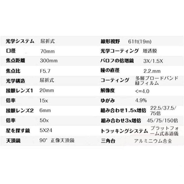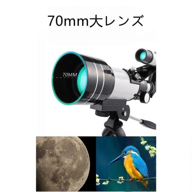 70mmの開口と300mmの焦点距離を持つ屈折天文望遠鏡。