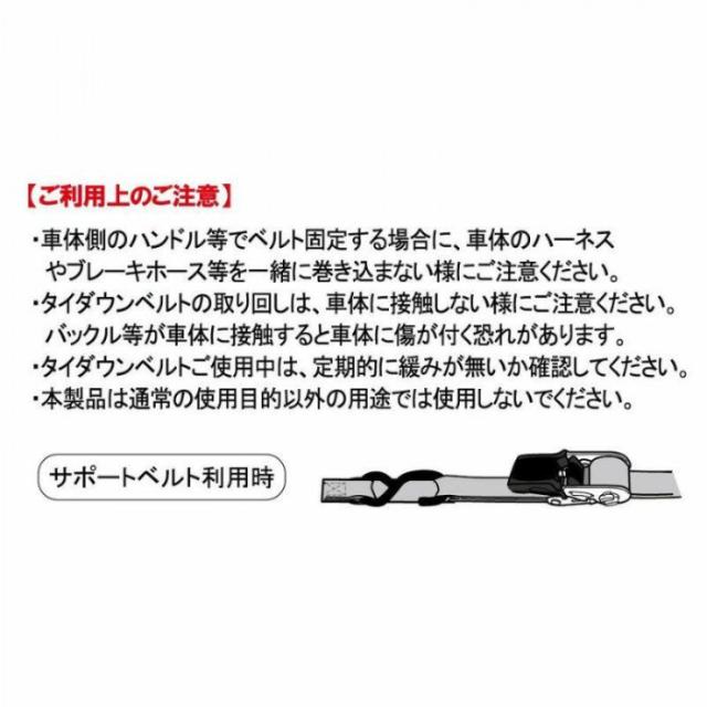 | 締め付けに便利なラチェット機能付きタイダウンベルトです。 【ご利用上のご注意】 ※車体側のハンドル等でベルト固定する場合に、車体のハーネスやブレーキホース等を一緒に巻き込まない様にご注意ください。 ※タイダウンベルトの取り回しは、車体に接触しない様にご注意ください。バックル等が車体に接触すると車体に傷が付く恐れがあります。 ※タイダウンベルトご使用中は、定期的に緩みが無いか確認してください。 ※本製品は通常の使用目的以外の用途では使用しないでください。 (サポートベルト利用時) |