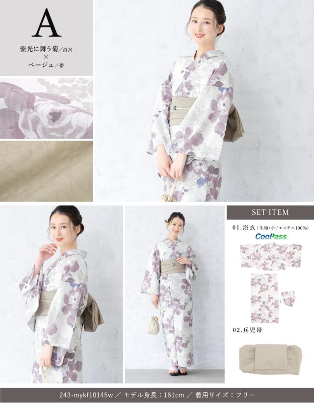 浴衣 セット レディース 二部式 セパレート 浴衣セット 兵児帯 floro 簡単 悩まない 涼しい コーディネート済み 白 紫 ベージュ ピンク 菊 花柄 大人 おしゃれ フリー 送料無料