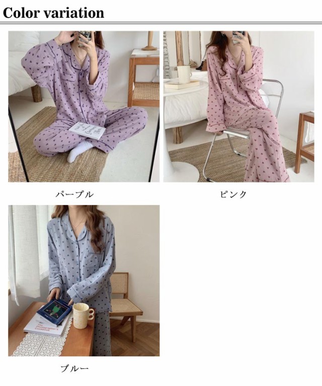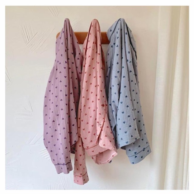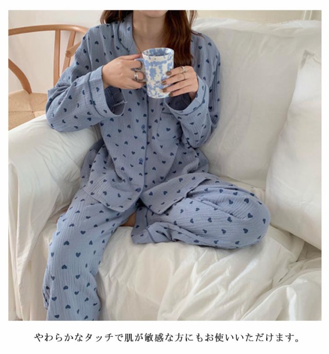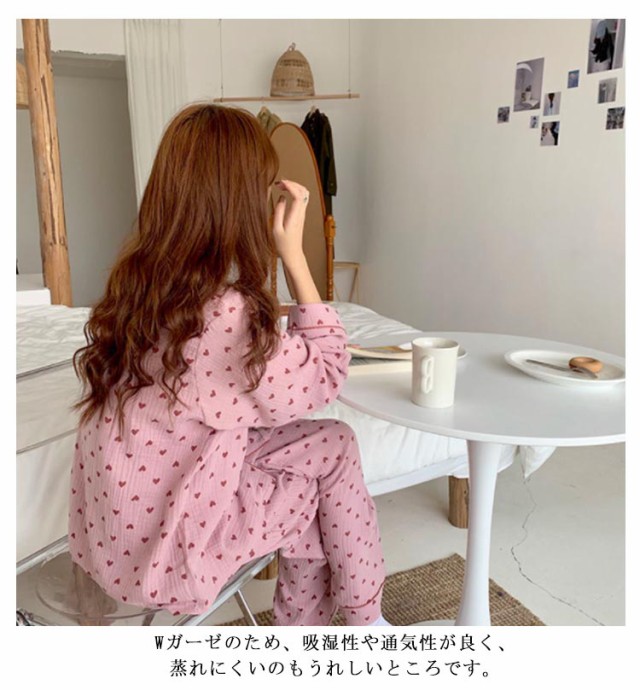 部屋着 ハート柄 総柄 前開き Wガーゼ セットアップ パジャマ ロングパンツ 大きいサイズ ダブル ガーゼ 二重ガーゼ かわいい 上下セット 長ズボン レディース 女子 学生 ルームウェア おしゃれ 可愛い 100%綿 ナチュラル 春夏 秋冬 寝巻き ナイトウェア 長袖