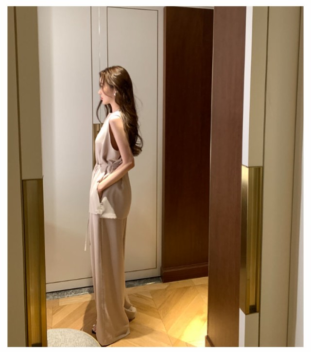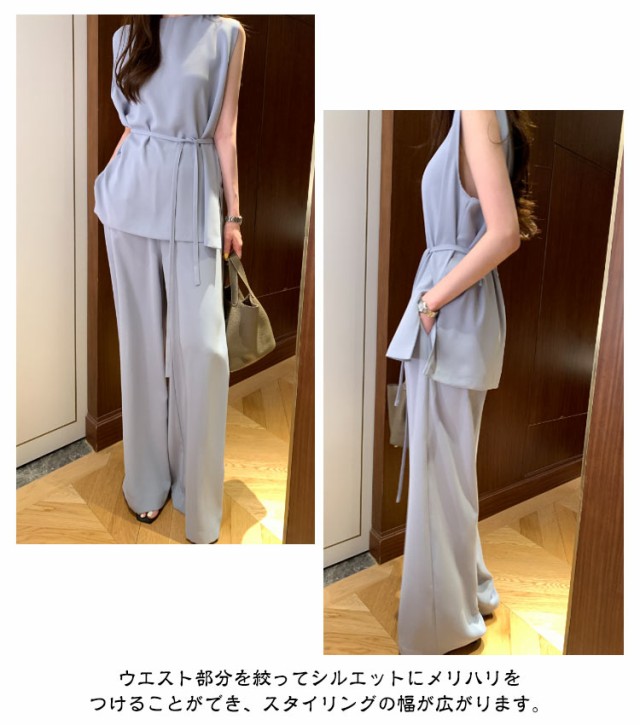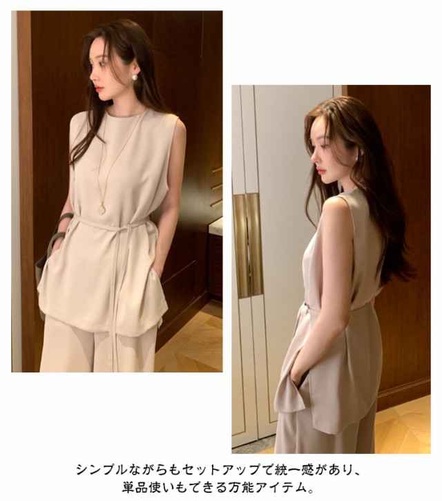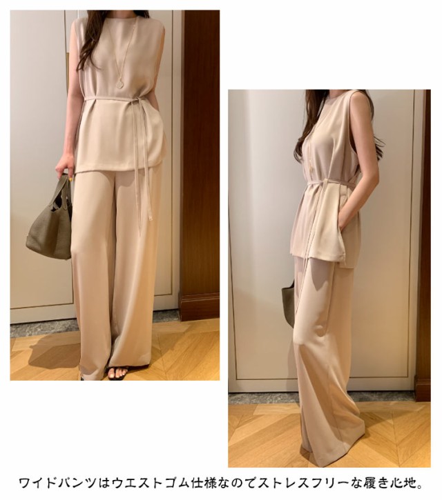 | ノースリーブトップス×ワイドパンツセットアップの登場。 暑い夏にはさらりと着用するだけでカジュアルになりすぎず、上品に涼しく快適に過ごせます。 トップスはヒップが隠れる丈感で、体型をカバーしつつバランス良く着こなせます。 ウエスト部分を絞ってシルエットにメリハリをつけることができ、スタイリングの幅が広がります。 ワイドパンツはウエストゴム仕様なのでストレスフリーな履き心地。 シンプルながらもセットアップで統一感があり、単品使いもできる万能アイテム。 | |
