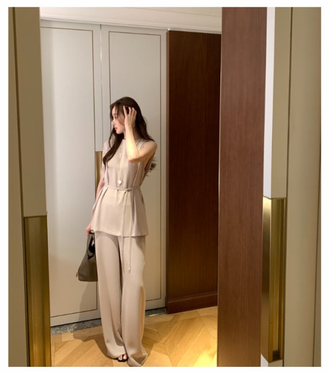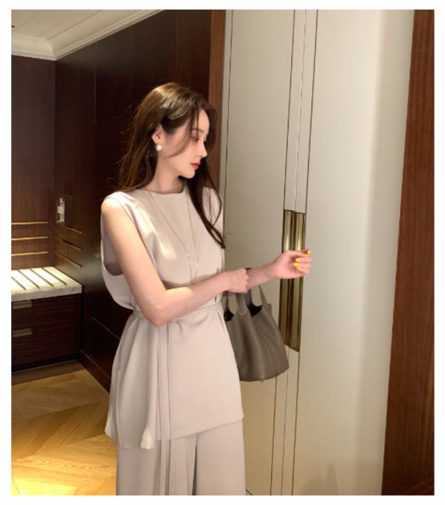 ノースリーブ きれいめ 体型カバー ストレートパンツ 夏 トップス ワイドパンツ クルーネック レディース 上下セット オフィス ブラウス ノースリーブ ゆったり 着?せ 2点セット 涼しい 黒 おしゃれ 通勤 セレモニー 結婚式