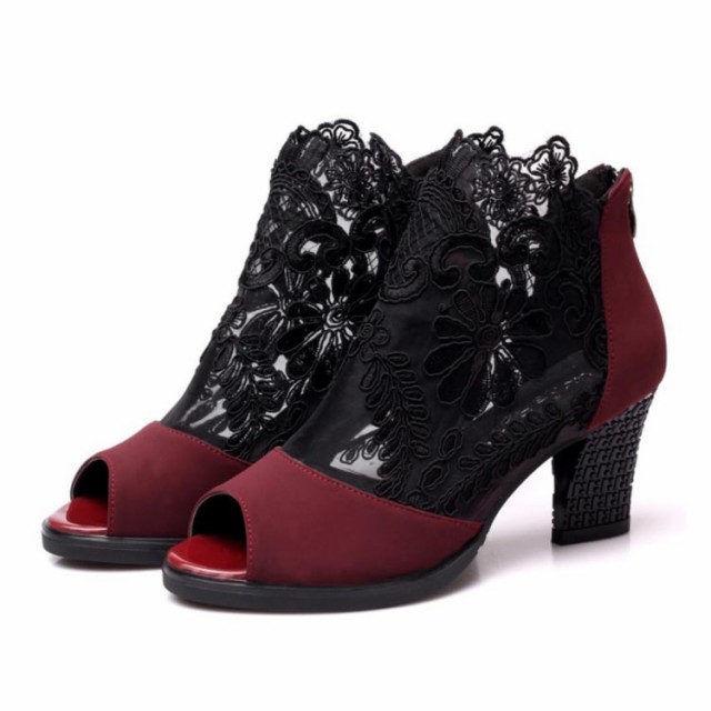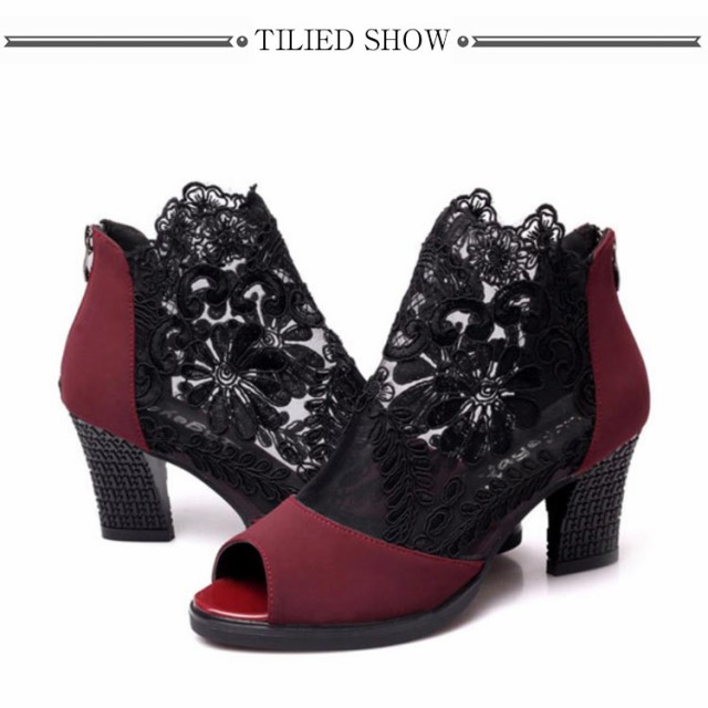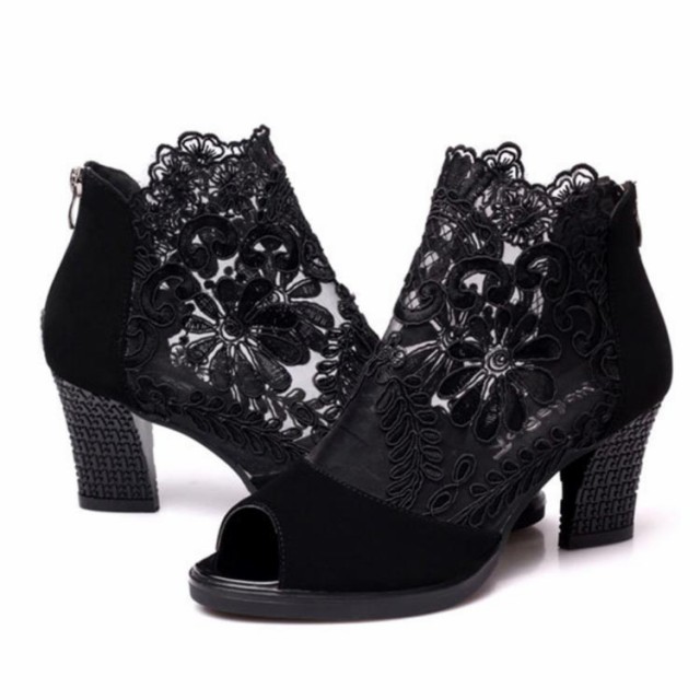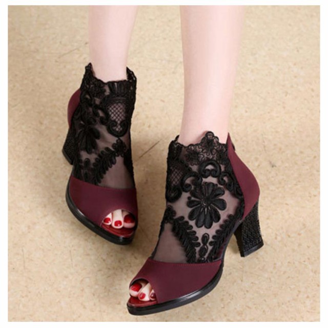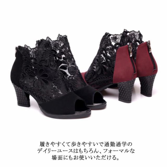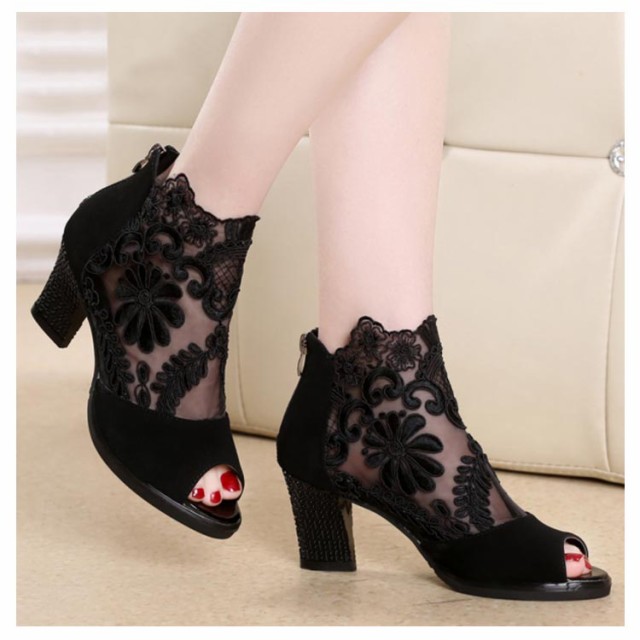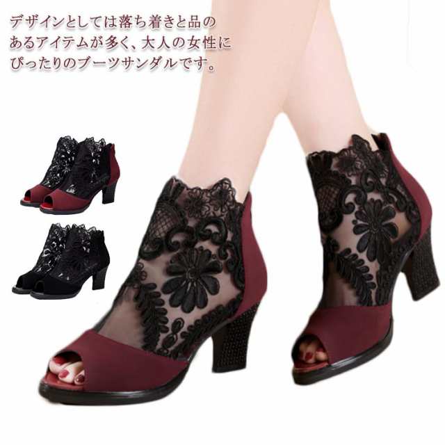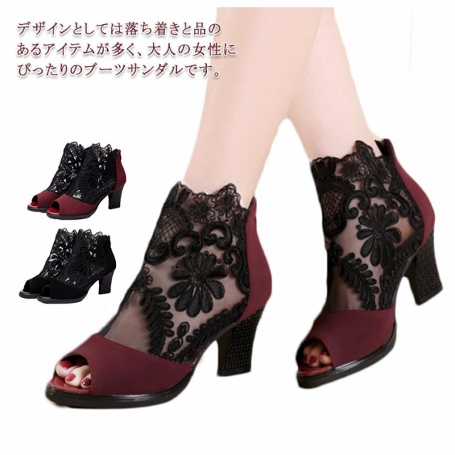 ショートブーツ サマーブーツ 花柄 レース オープントゥ サンダル 厚底 7cm チャンキーヒール 太ヒール レディース メッシュ 透け セクシー 美脚 歩きやすい 夏