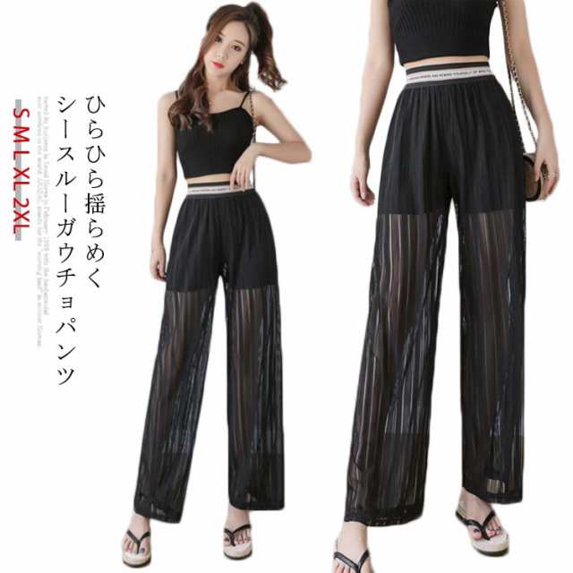 ガウチョパンツ レディース シースルーパンツ パンツ マキシパンツ ロングパンツ ガウチョ スカーチョ スカンツ 透け感 裏地付き ウエストゴム プリーツパンツ ボトムス 薄手 お洒落 キレイめ ふんわり 夏新作