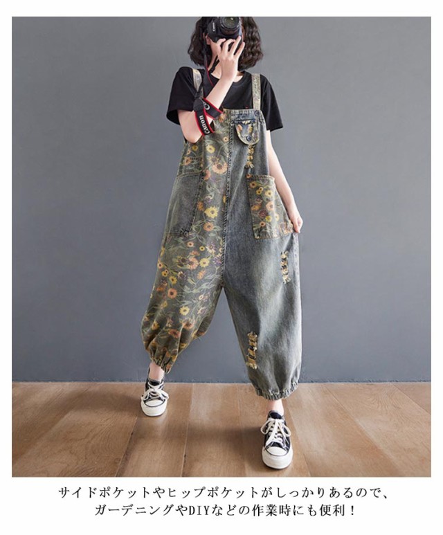 デニム サロペット パンツ オーバーオール レディース 作業ズボン サルエルパンツ ワークパンツ 作業服 デニムパンツ 花柄 プリント オールインワン カーゴパンツ ビッグポケット ゆったり オーバーサイズ 春 夏 秋 冬 【送料無料】