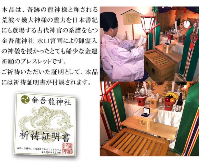 当商品は日本最古の龍神様である荒波々畿大神様を祀られている金吾龍神社様に特別金運祈願を祈祷していただいた金運ブレスレットです。