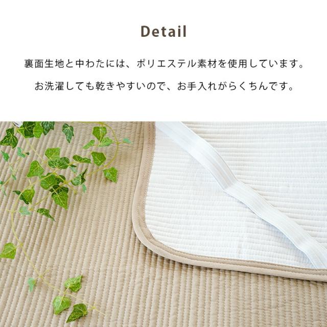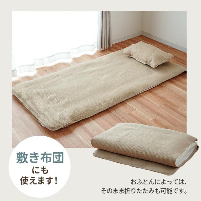 | ・汗をかいてもベタつきにくい 凹凸のある細かなポコポコキルトは、お肌との接地面が少ないので蒸れにくく気持ちいい。 お肌に直接触れる表生地に、天然素材の綿を使用。 先に一度、水を通した生地で作りました。 コンパクトに折りたためて、ご家庭でお洗濯OKだから毎日清潔にお使いいただけます。 ベッドマットレスにも、敷き布団にも使えます。 | |