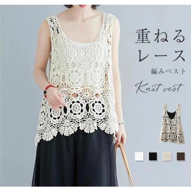 ベスト レディース 春夏 大きいサイズ トップス ジレ Vネック 花柄 透かし編み ノースリーブ サマーニット プルオーバー 春 夏 レイヤード 重ね着 袖なし