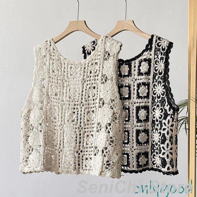 ベスト ジレ レディース 秋 花柄 刺繍 レース クロシェ編み 丸首 ノースリーブ トップス