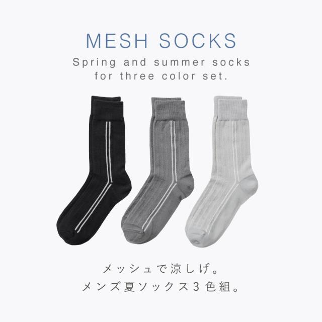 メッシュで涼感。口ゴムゆったりのメンズソックス3色セット。レッグ部、足の甲側部がメッシュ編みで夏にぴったりの涼しいソックス。